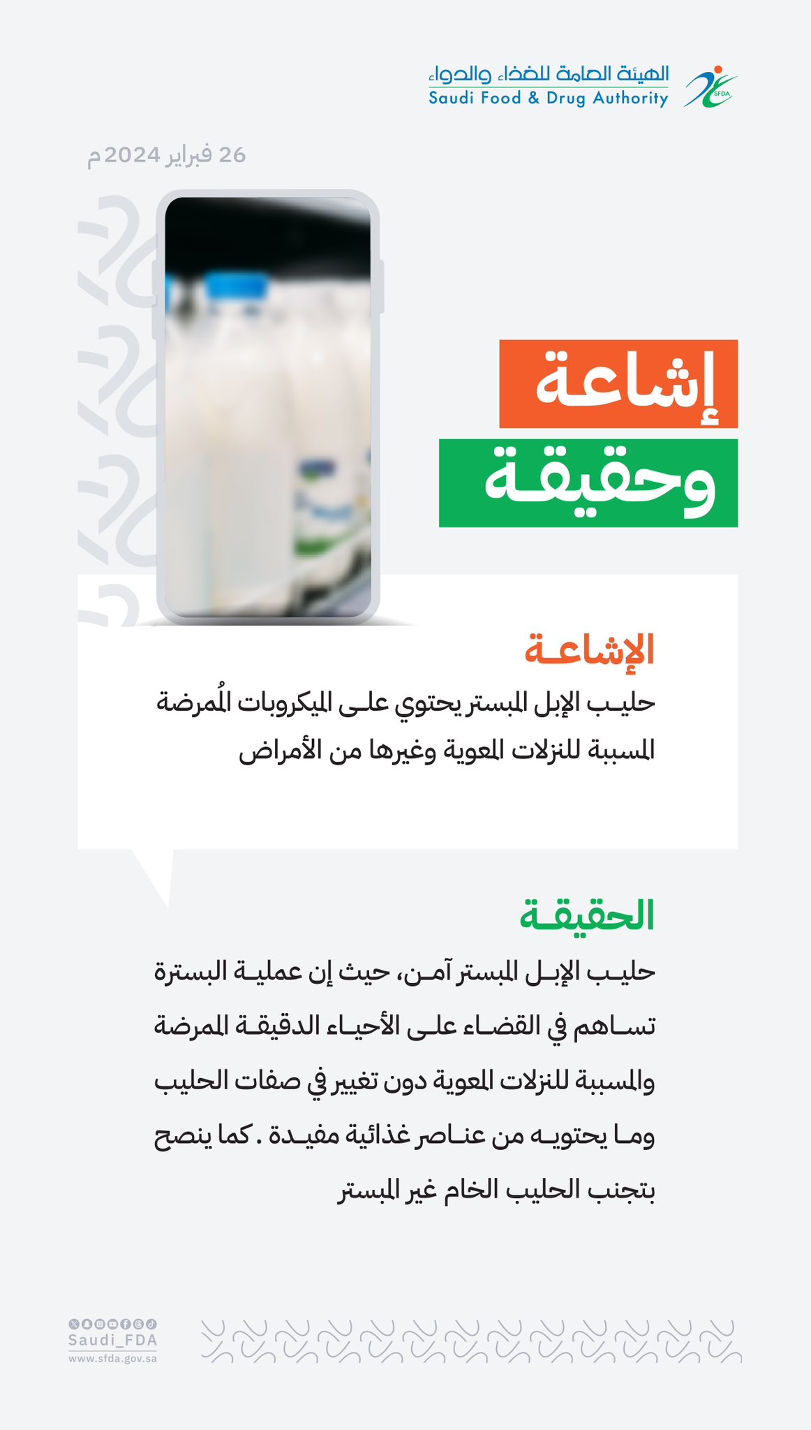 أكدت هيئة الغذاء والدواء عدم صحة المعلومات الشائعة بشأن احتواء حليب الإبل “المبستر” على البكتيريا الممرضة.
