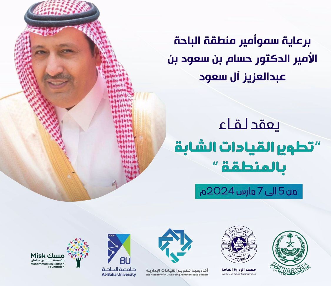 يرعى صاحب السمو الملكي الأمير الدكتور حسام بن سعود بن عبدالعزيز أمير منطقة الباحة، لقاء “تطوير القيادات الشابة بمنطقة الباحة”، الذي ينظمه معهد الإدارة العامة ممثلاً بأكاديمية تطوير القيادات الإدارية، بالشراكة مع جامعة الباحة ومؤسسة محمد بن سلمان (مسك)، وذلك من يوم 5 إلى 7مارس 2024م.