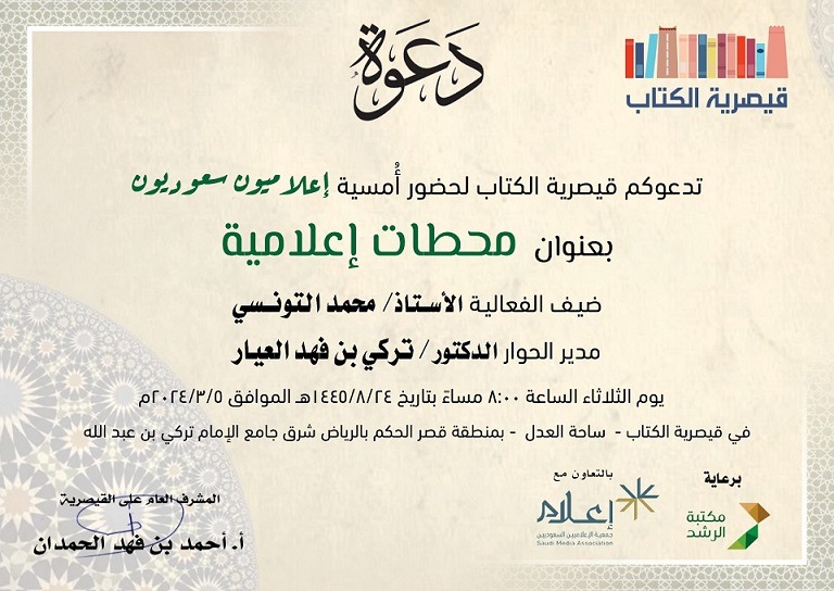تستضيف قيصرية الكتاب برعاية مكتبة الرشد وبالتعاون مع جمعية الإعلاميين السعوديين أمسية إعلاميون سعوديون بعنوان “محطات إعلامية”، تستضيف فيها الأستاذ محمد التونسي ، ويدير الحوار د. تركي بن فهد العيار، وذلك في الثامنة مساء يوم الثلاثاء بتاريخ ١٤٤٥/٠٨/٢٤ الموافق ٢٠٢٤/٠٣/٠٥م