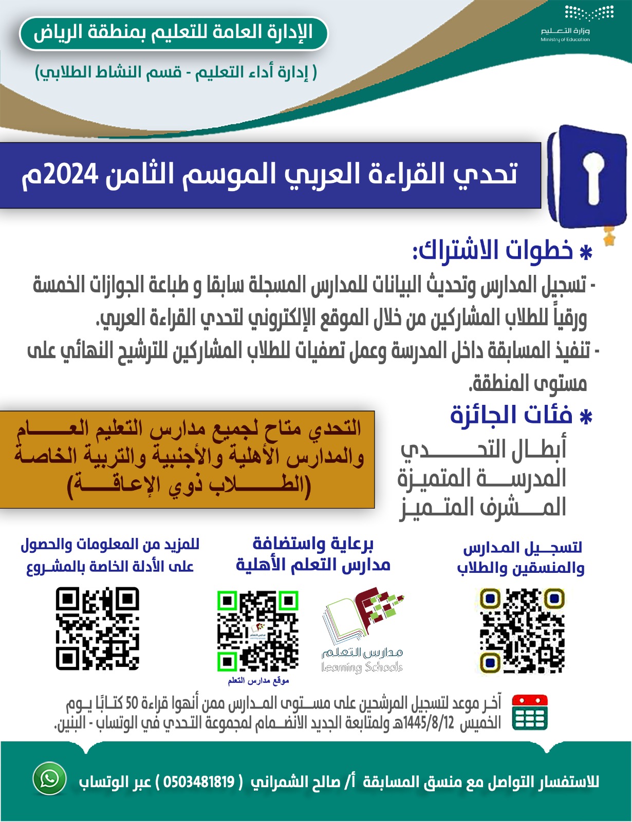 تستضيف مدارس التعلم النموذجية الأهلية بحي قرطبة التصفيات النهائية لتحدي القراءة العربي الموسم الثامن ٢٠٢٤م، على مستوى منطقة الرياض.