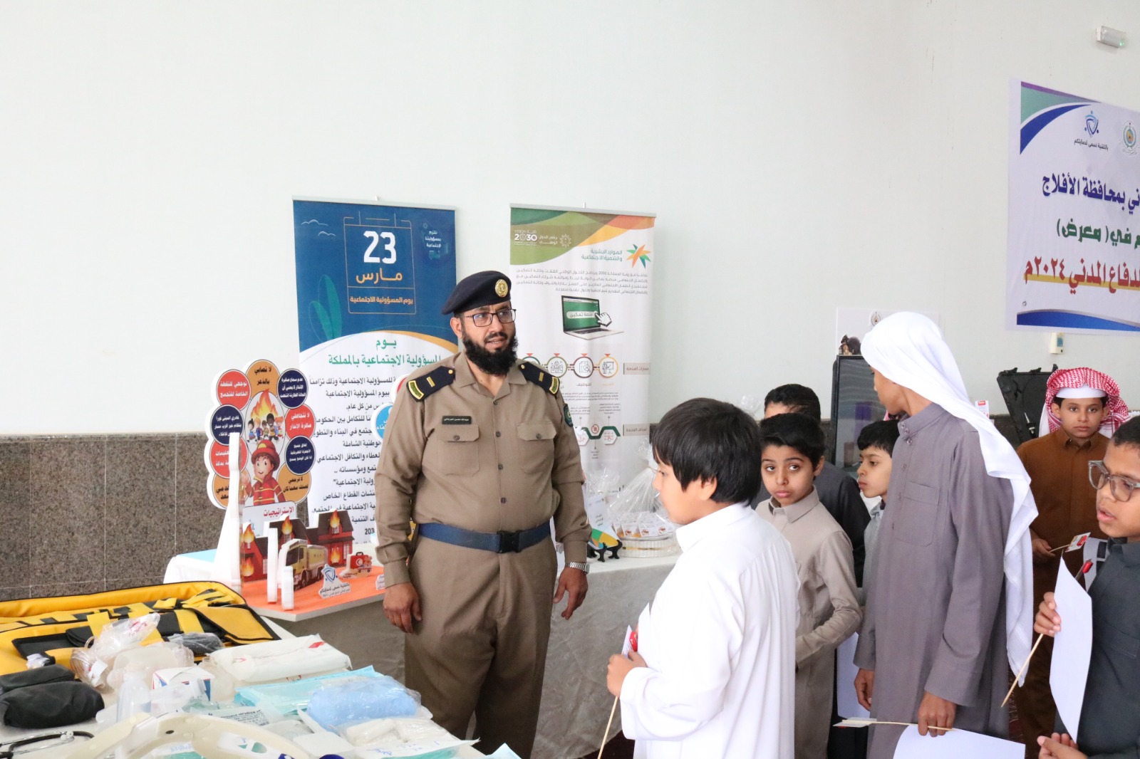 شارك مكتب الضمان الاجتماعي بالأفلاج بركن تعريفي وتوعوي في معرض فعاليات اليوم العالمي للدفاع المدني تحت عنوان (بالتقنية نسعى لحمايتكم) والمقام في إدارة الدفاع المدني بالافلاج وبتنظيم وتجهيز من القسم النسائي وفريق ضياء التطوعي التابع للمكتب وشتمل الركن على منشورات تعريفية بالضمان الاجتماعي المطور والتمكين للمستفيدين ودور المسؤولية الاجتماعية في الشراكات المجتمعية على المستوى المحلي بالاضافة الى توزيعات للزائرين للمعرض وربط المستفيدين من الضمان بالشعار العالمي ( بالتقنية نسعى لحمايتكم )