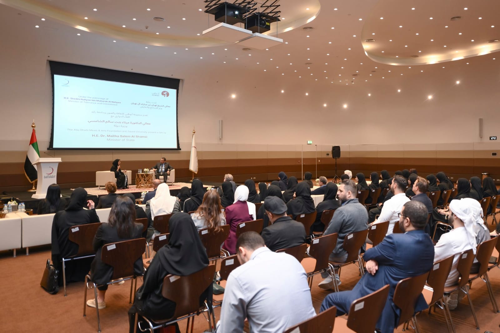 احتفالاً بيوم المرأة العالمي، نظّمت مجموعة أبوظبي للثقافة والفنون، بالتعاون مع جامعة زايد، لقاءً حوارياً مع معالي الدكتورة ميثاء بنت سالم الشامسي، وزيرة دولة، حول كتابها “فاطمة بنت مبارك.. إضاءات في الفكر والعمل”، وما تتميز به سمو الشيخة فاطمة بنت مبارك “أم الإمارات” من صفات، وما قامت به من أدوار ريادية إلى جانب المغفور له بإذن الله الشيخ زايد بن سلطان آل نهيان، طيّب الله ثراه، حققت سموّها خلالها إنجازات فريدة في مسيرة استدامة نهضة الإمارات.