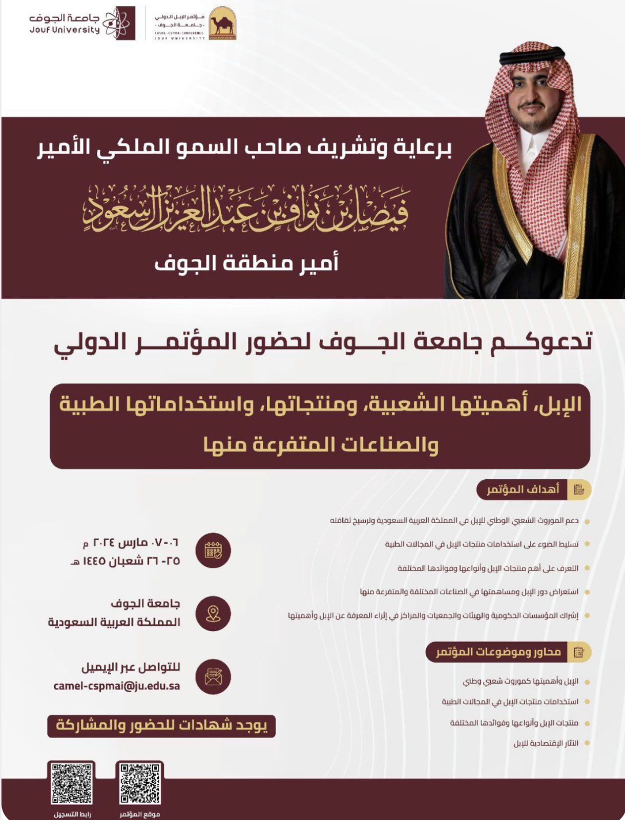 برعاية صاحب السمو الملكي الأمير فيصل بن نواف بن عبدالعزيز أمير منطقة الجوف، تقيم جامعة الجوف بالشراكة مع إمارة المنطقة يوم الأربعاء القادم المؤتمر الدولي “الإبل، أهميتها الشعبية، ومنتجاتها، واستخداماتها الطبية، والصناعات المتفرعة عنها” والذي يستمر لمدة يومين.