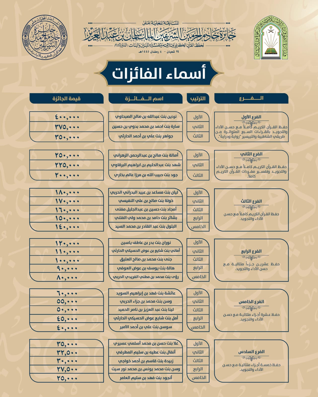 اعتمد معالي وزير الشؤون الإسلامية والدعوة والإرشاد الشيخ الدكتور عبداللطيف بن عبدالعزيز آل الشيخ، نتائج وأسماء الفائزات في المسابقة المحلية على جائزة خادم الحرمين الشريفين الملك سلمان بن عبدالعزيز آل سعود لحفظ القرآن الكريم وتلاوته وتفسيره للبنين والبنات في دورتها الخامسة والعشرين، التي عُقدت تصفياتها النهائية في مدينة الرياض خلال الفترة من 24 – 29 شعبان لعام 1445هـ، بمشاركة 125 متسابقاً ومتسابقةً تنافسوا على فروع المسابقة الستة ويبلغ إجمالي الجوائز أكثر من 7.000.000 ملايين ريال