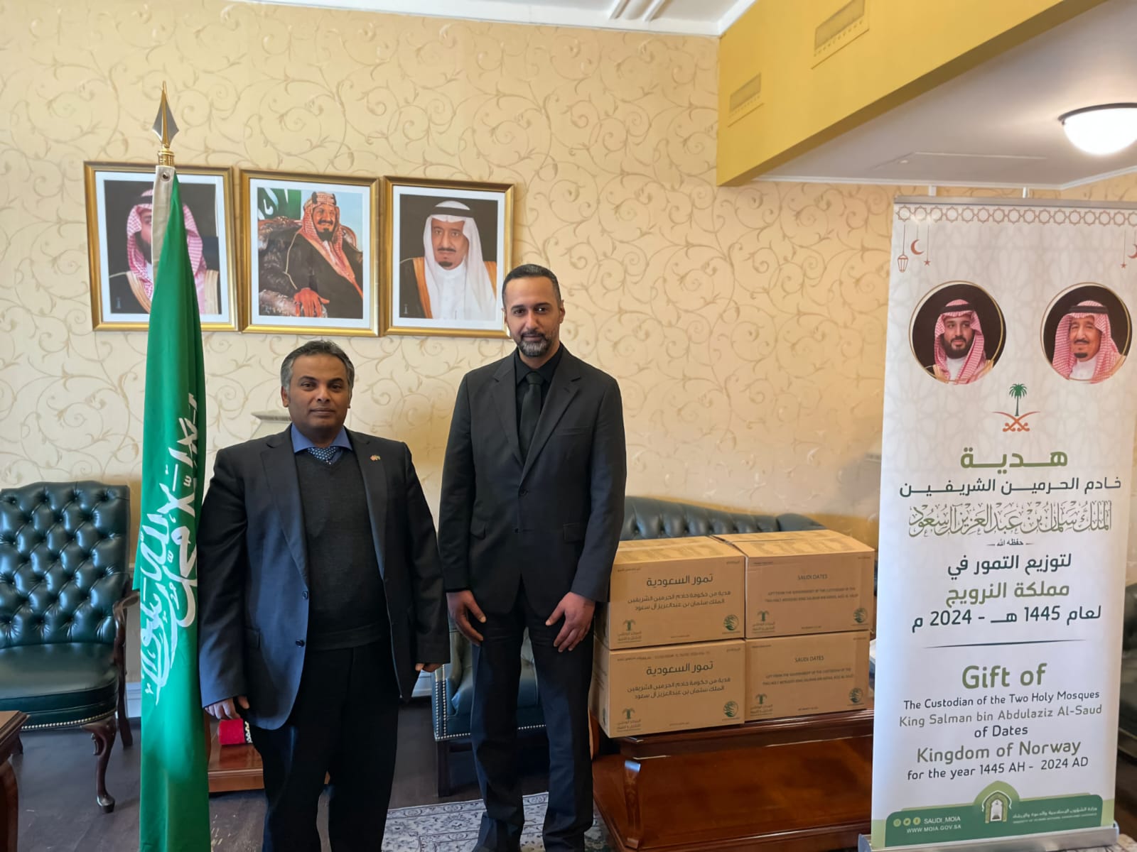 دشنت وزارة الشؤون الإسلامية والدعوة والإرشاد، أمس، بمقر سفارة المملكة في العاصمة النرويجية أوسلو، برنامج هدية خادم الحرمين الشريفين من التمور في مملكة النرويج، بحضور القائم بالأعمال بالسفارة الأستاذ أحمد الحربي.