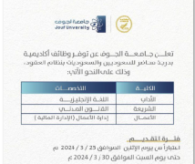 أعلنت جامعة الجوف عن توفر وظائف أكاديمية بدرجة “محاضر” للسعوديين والسعوديات بنظام العقود ” في التخصصات العلمية اللغة الإنجليزية، القانون المدني، وتخصص إدارة الأعمال (الإدارة المالية)،اعتباراً من يوم الاثنين الموافق 2024/3/25 حتى تاريخ 2024/3/30م.