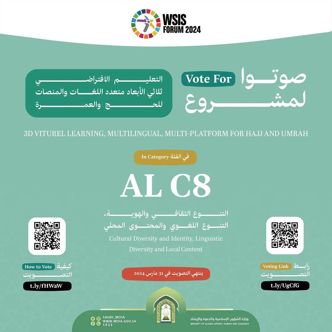 بدأ العد التنازلي للتصويت لمشروع تقدمت به المملكة ممثلة بوزارة الشؤون الإسلامية والدعوة والإرشاد، للمنافسة بالفوز بجائزة القمة العالمية لمجتمع المعلومات 2024، عبر برنامج “التعليم الافتراضي ثلاثي الأبعاد متعدد اللغات والبيئات للحج والعمرة”، والذي يختتم