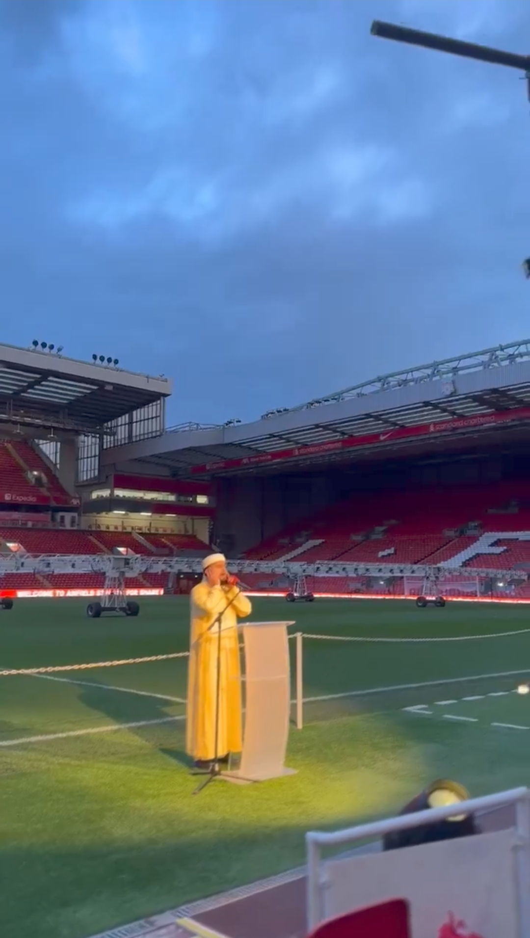 وانتشر فيديو عبر مواقع التواصل الاجتماعي، يتضح من خلاله رفع أذان المغرب وقت الإفطار في ملعب “آنفيلد” معقل نادي ليفربول الإنجليزي.
