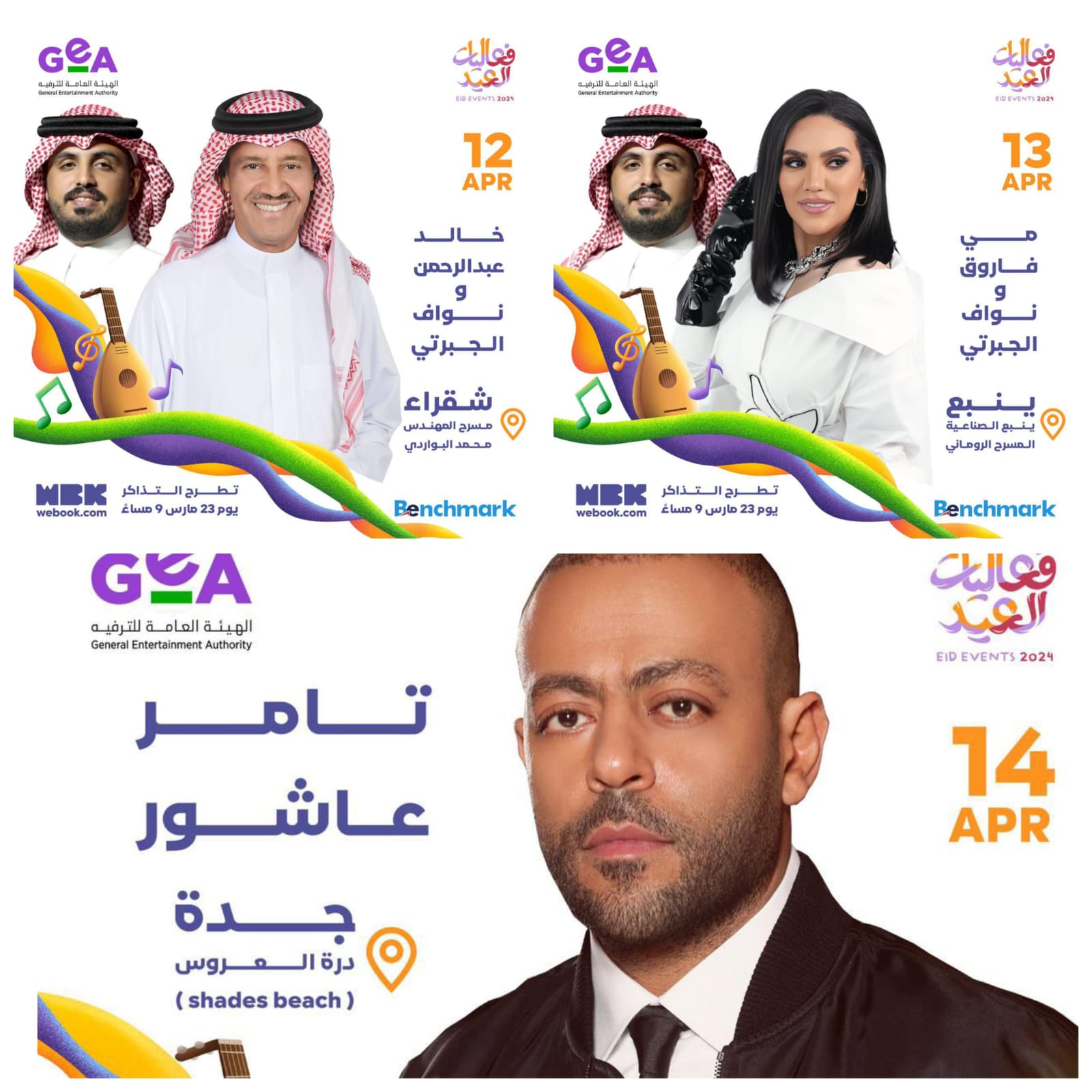 حيث يقام لأول مره حفل غنائي ترفيهي في شقراء بالرياض، يحيه كل من الفنان خالد عبدالرحمن والفنان نواف الجبرتي تاريخ 12 أبريل، كما تشارك الفنانة مي فاروق والفنان نواف الجبرتي جمهور مدينة ينبع 13 أبريل فرحة العيد في ليلة طرب ومغنى، وتختتم حفلات العيد في جدة مع الفنان تامر عاشور في 14 أبريل.