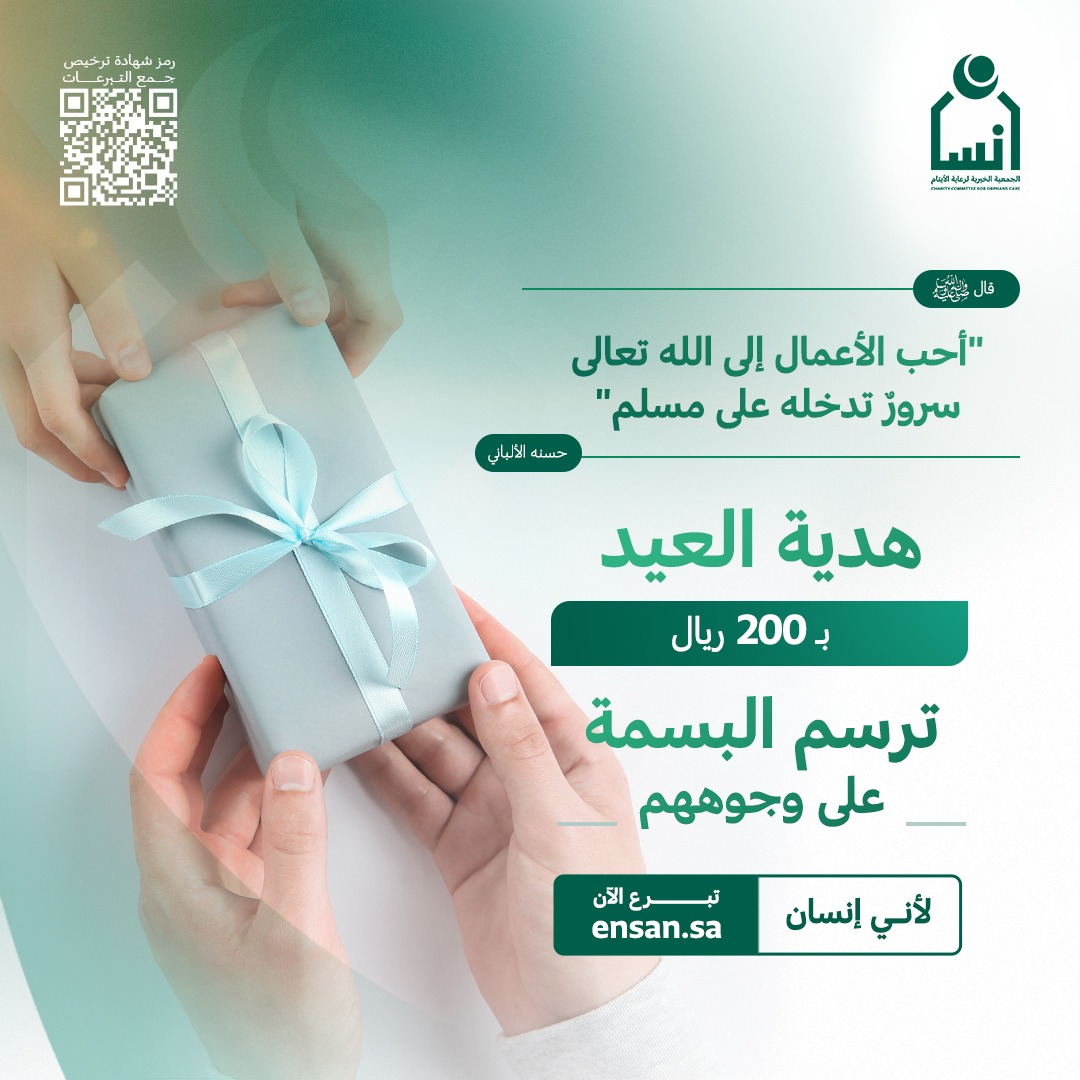وحثّت الجمعية رجال الأعمال والمتبرعين على المساهمة في مشروع هدية العيد، وتجسيد المسؤولية الاجتماعية، والتكاتف بين أفراد المجتمع الواحد، من خلال التبرع بقيمة الهدية، وإيداع المبلغ في حسابات الجمعية، أو زيارة أحد فروع الجمعية أو التبرع عن طريق منصة إنسان https://ensan.sa/ar/shop/104