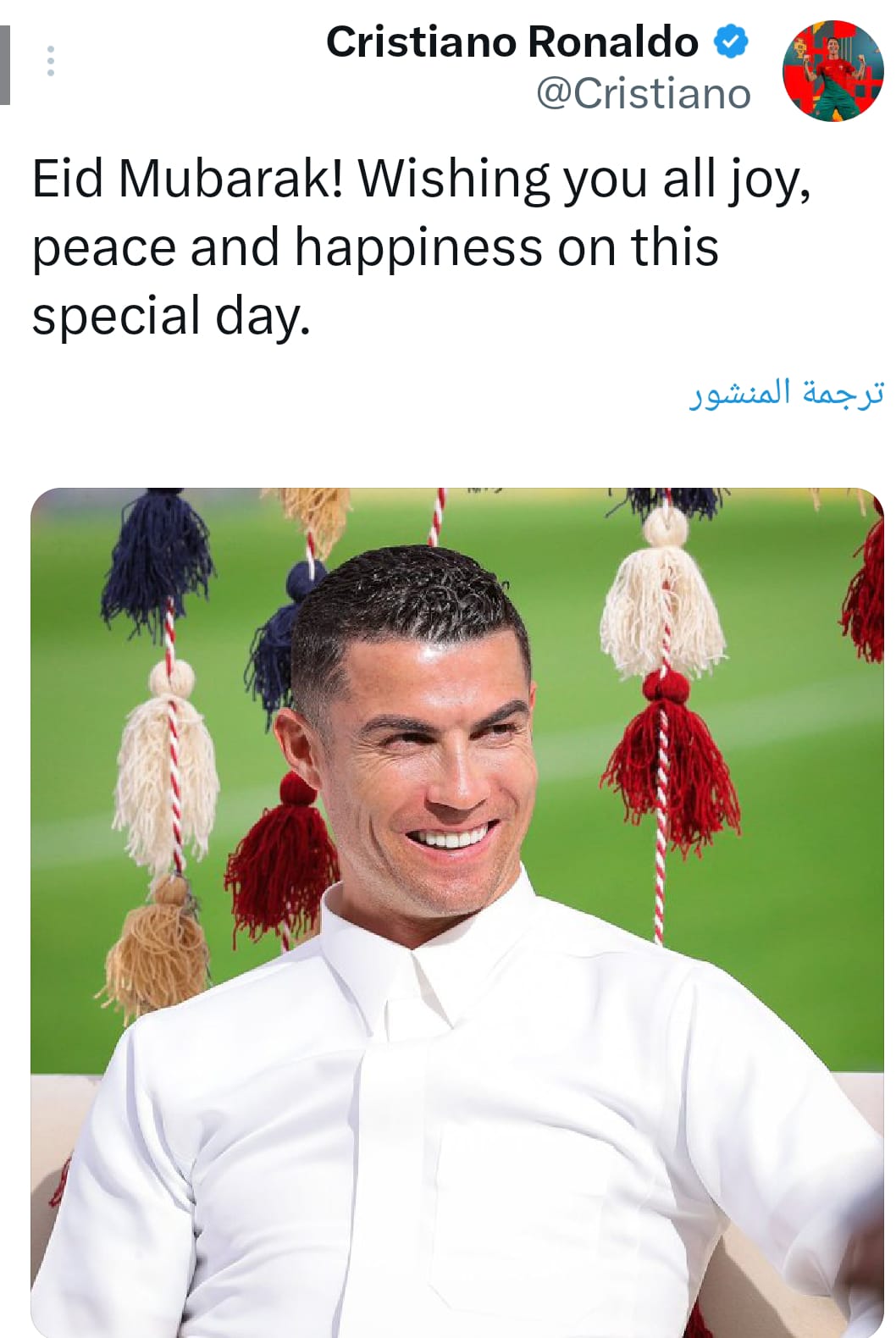 في تغريدة من حساب الأسطورة اللاعب كريستيانو رونالدو . هنأ المسلمين بعيد الفطر..