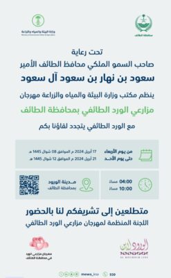 كشف مدير عام فرع وزارة البيئة والمياه والزراعة بمنطقة مكة المكرمة المهندس ماجد بن عبدالله الخليف عن موعد انطلاق ” مهرجان مزارعي الورد ” تحت رعاية صاحب السمو الملكي الأمير سعود بن نهار آل سعود محافظ الطائف يوم الاربعاء المقبل 8شوال الموافق 17ابريل بمدينة الورود بالمحافظة .