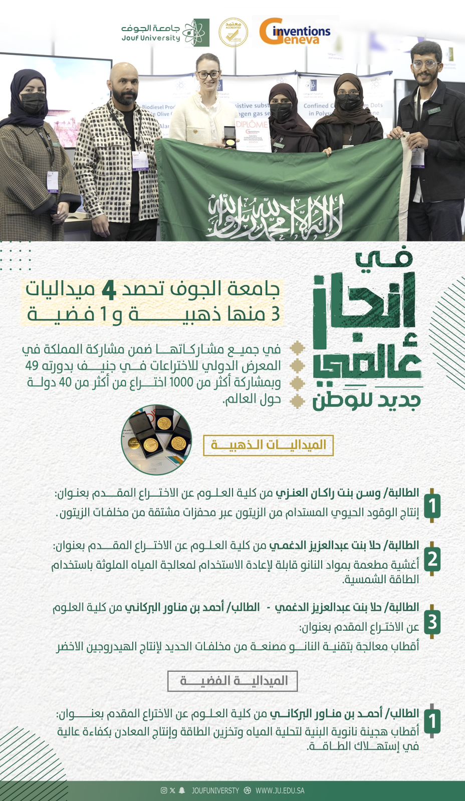 حصدت جامعة الجوف 4 ميداليات ذهبية وفضية في جميع مشاركاتها ضمن مشاركة الجامعة في المعرض الدولي للاختراعات في جنيف بدورته 49، خلال الفترة من 17 – 21 أبريل 2024م؛ بمشاركة 26 جامعة سعودية، وبمشاركة أكثر من 1000 اختراع من أكثر من 40 دولة حول العالم.