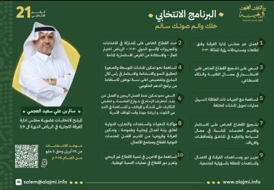 فعلى سبيل المثال تواجد منذُ اليوم الأول في مقر المرشح رقم 21 سالم بن علي بن سعيد العجمي ” ابن بغيّه” العديد من رجال الأعمال ومشائخ القبائل والإعلاميين والمشاهير وقد جاء في برنامجه الإنتخابي تشجيع المنشآت المتوسطة والصغيرة لتحقيق النمو والاستدامة والعمل مع جهات التمويل لتسهيل تمويل المنشآت وكذلك العمل عبر مجلس إدارة الغرفة وفق تطلعات ومستهدفات رؤية المملكة 2030 تشجيع المنشآت على الاستفادة من الفرص الاستثمارية المتاحة في إكسبو الرياض 2030 تشجيع المنشآت على الاستثمار في التقنية والذكاء الاصطناعي أيضاً هناك الشاب الطموح