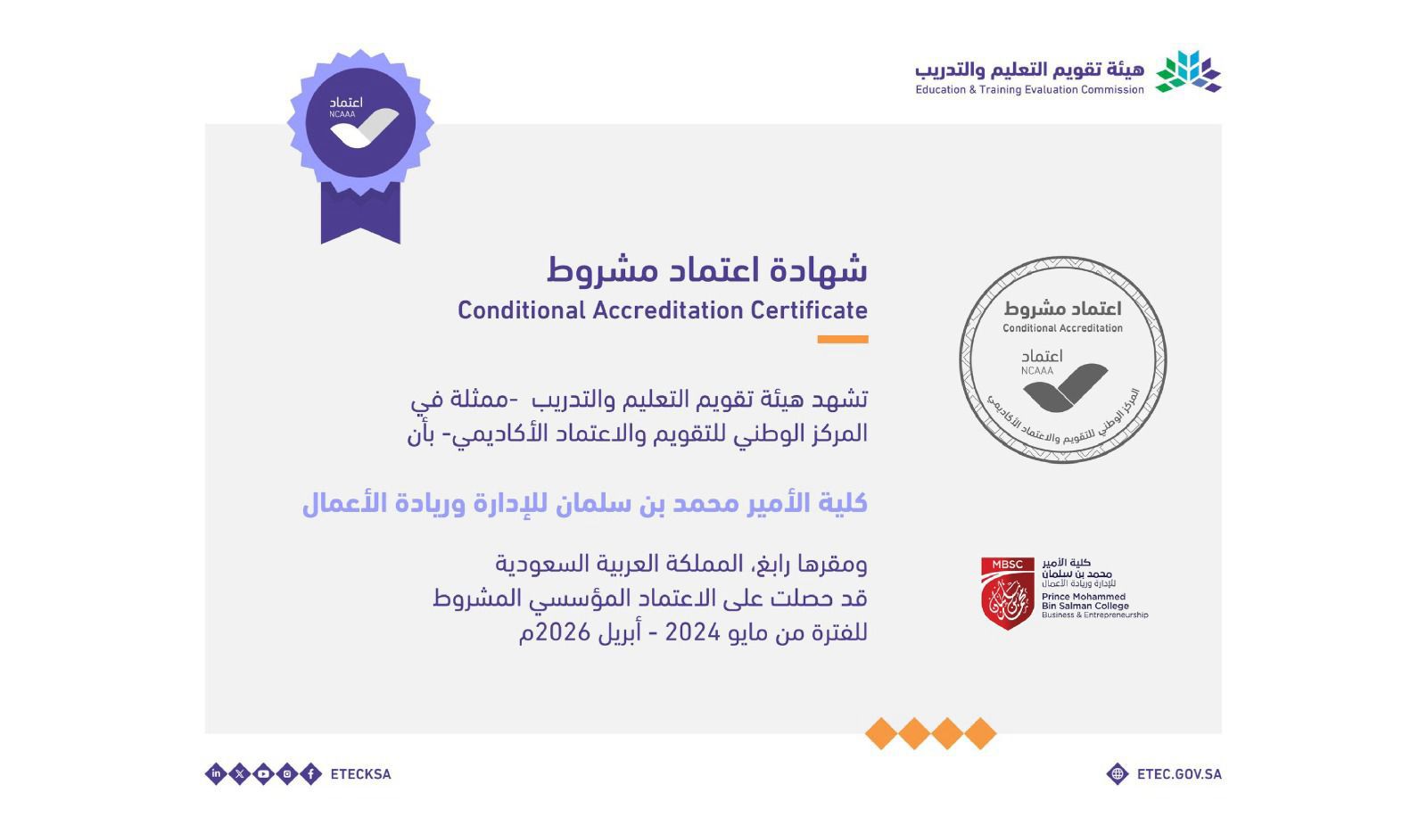 أعلنت كلية الأمير محمد بن سلمان للإدارة وريادة الأعمال، المتخصصة بتقديم تعليم ذي مستوى عالمي هنا في المملكة، عن حصولها على الاعتماد المؤسسي المشروط من المركز الوطني للتقويم والاعتماد الأكاديمي (NCAAA)، التابع لهيئة تقويم التعليم والتدريب (ETEC) ابتداءً من مايو 2024 حتى أبريل 2026.