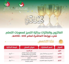 أعلنت الجمعية الخيرية لصعوبات التعلم عن الفائزين في الدورة العاشرة من جائزة التميز لصعوبات التعلم والتي دشنها صاحب السمو الملكي الأمير فيصل بن بندر آل سعود أمير الرياض، والساعية إلى الإسهام في تعزيز التميز والإبداع في مجال صعوبات التعلم وإثراء ميدان صعوبات التعلم بالمشاركات المميزة حيث بلغ عدد الفائزين في فئة التخصص أربعة فائزين وهم: في المركز الثاني الأستاذ محسن آل عزيز (تطبيق تواصل صعوبات التعلم التفاعلي بين المعلم والأسرة)، وفي المركز الثالث فاز في العمل المشترك كل من الدكتور محمد الشبيب والأستاذ أحمد مجرشي (التقويم التفاعلي لبرامج صعوبات التعلم)، كما فازت في المركز الرابع الأستاذة امتنان سعود المغربي (تنمية مهارات الكتابة باستخدام القصص الرقمية).وقد تم حجب المركزين الأول والخامس لعدم بلوغ بقية المشاركات درجات الحد الأدنى لهذين المركزين.