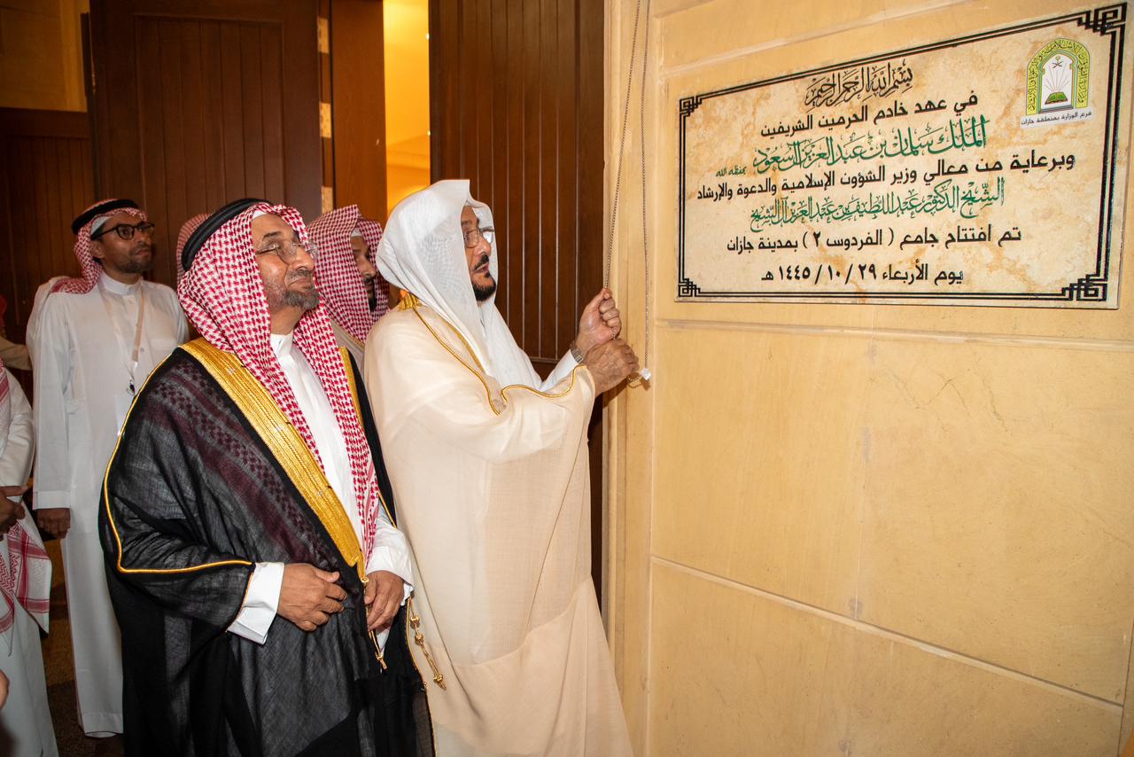 افتتح معالي وزير الشؤون الإسلامية والدعوة والإرشاد الشيخ الدكتور عبداللطيف بن عبدالعزيز آل الشيخ مساء أمس الأربعاء التاسع والعشرون من شهر شوال الجاري ١٤٤٥هـ ، جامع الفردوس بمدينة جيزان، وذلك ضمن زيارته الحالية للمنطقة، بحضور وكلاء الوزارة وعدد من مديري الإدارات ، ومدير عام فرع الوزارة بالمنطقة فضيلة الشيخ أسامة بن زيد المدخلي، وأهالي المنطقة .