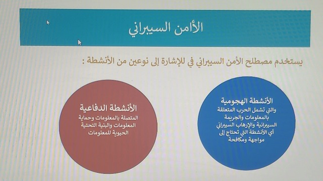 ويهدف إلى ضمان سرية وسلامة توافر الأنظمة التي يتم فيها معالجة المعلومات، واكتشاف أي هجمات، واستعادة كفاءة هذه الأنظمة بأسرع وقت، ويستخدم للإشارة إلى نوعين: الأنشطة الهجومية والأنشطة الدفاعية. وأكدت أن الأمن السيبراني يحمي المعلومات في الفضاء السيبراني، بينما أمن المعلومات ويركز على المعلومات الرقمية وغير الرقمية، ويجتمعان معا إذا كانت المعلومات رقمية فقط. ثم تحدثت عن أهمية الأمن السيبراني وأهدافه، والجرائم السيبرانية، وعناصر الجريمة السيبرانية والفرق بين الجرائم السيبرانية والهجمات السيبرانية والحروب السيبرانية، وبعد ذلك تحدثت عن أغراض الجرائم السيبرانية وأهدافها، وأشكالها، وأنماطها، وخصائصها.
