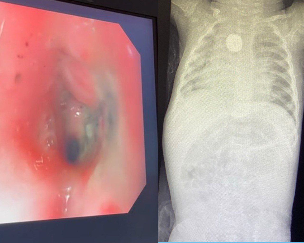 وأضاف تبين وجود حروق داخل المريء مع تضيق المنطقة المتأثرة وعدم رؤية الجسم الغريب مبدئيا وبعد عدة محاولات اتضح وجوده ملتصقاً ومغطى بأغشية الجدار داخليا، مما أتاح إمكانية سحبه بالمنظار بسلام دون حدوث ثقب أو نزيف في المنطقة ذاتها، وجرى إدخال المنظار مرة أخرى والتأكد من عدم وجود ثقب أو تسرب هوائي داخل الصدر.