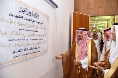 بعد ذلك شاهد سمو أمير منطقة نجران والحضور عرضاً مرئياً عن مدارس دار الأحفاد وما تحويه من مرافق تعليمية، ثم دشّن سموه مدرسة دار الأحفاد العالمية، تلا ذلك أوبريتاً بعنوان “هنا الأحفاد”.