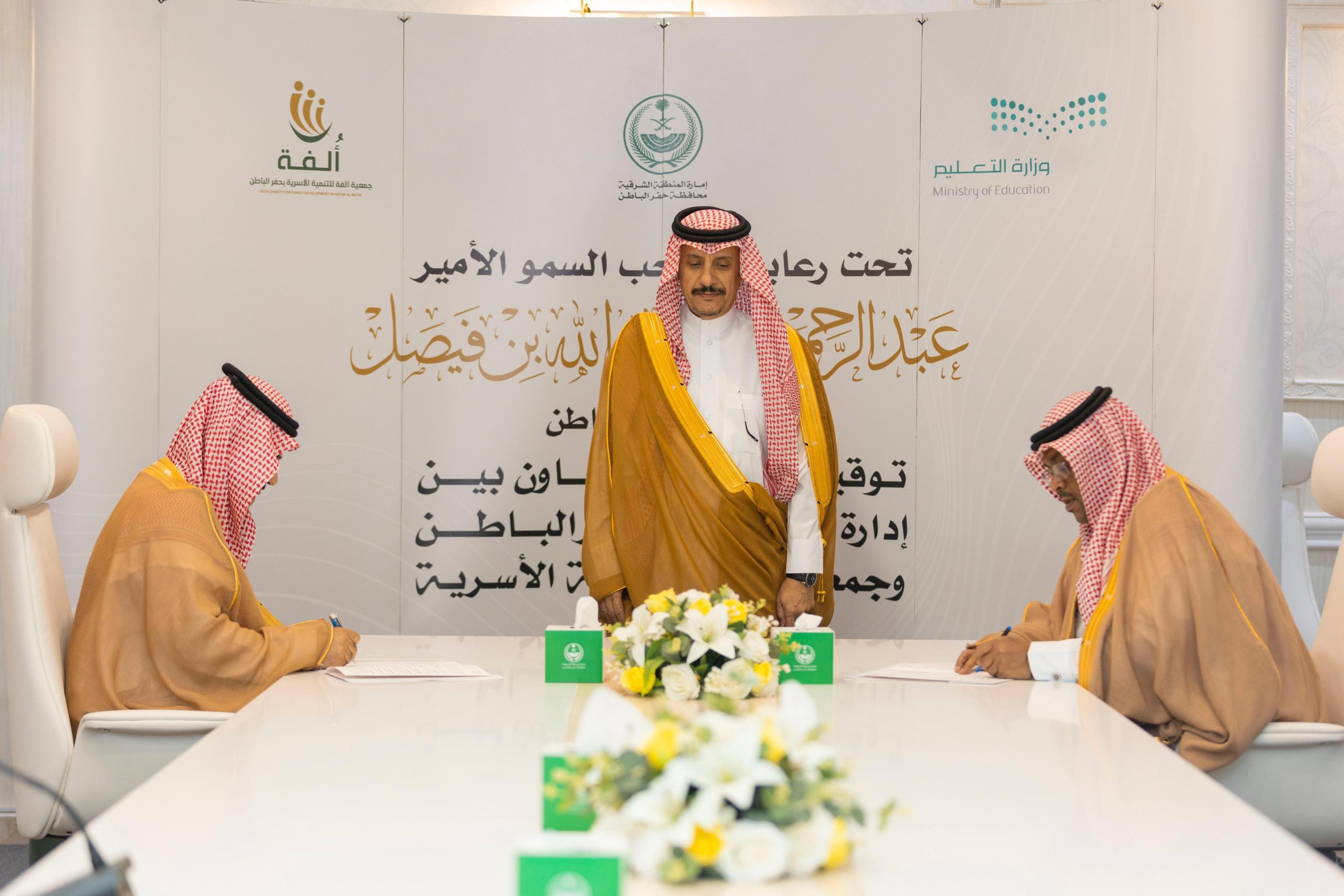 رعى صاحب السمو الأمير عبد الرحمن بن عبد الله بن فيصل – محافظ حفر الباطن – مذكرة تفاهم بين إدارة تعليم حفرالباطن وجمعية ألفة للتنمية الأسرية بمقر المحافظة ، جاء ذلك أثناء استقبال سموه لمدير التعليم الأستاذ محمد شاطري ونائب رئيس مجلس إدارة جمعية ألفة الأستاذ سلمان العقيل ويرافقة مدير عام الجمعية نايف الشريهي ومدير الحماية الأسرية حامد العيسى .وتهدف مذكرة التعاون إلى تحقيق عدد من مستهدفات المهم التي تعنى بتأهيل الكوادر البشرية في المجال الاجتماعي والمجال الأسري وفق أحدث المعايير والاستفادة من المختصين لتقديم برامج نوعية بالإضافة الى تنفيذ برامج ذات طابع تربوي وأجتماعي وأسري واستشاري و الاستفادة من المرافق والتجهيزات والموارد البشرية والمادية والتقنية لخدمة المستفيدين وأسرهم .