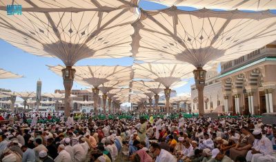 وتوافد المصلون منذ الصباح الباكر إلى المسجد، في جو مفعم بالطمأنينة والأمن والأمان والسكينة الذي امتلأت أروقته وساحاته والسطح بهم في جو مفعم بالطمأنينة والأمن والأمان وتوافر كل الخدمات العناية والرعاية الشاملة التي توليها القيادة لخدمة قاصدي الحرمين الشريفين من الحجاج والمعتمرين والزوار وتهيئة جميع السبل والإمكانات لراحتهم ليؤدوا عباداتهم بكل يسر وأمان واطمئنان.