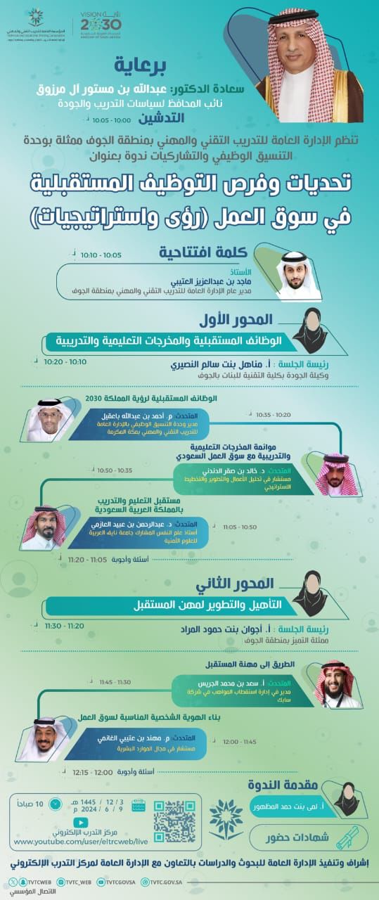 تنظم الإدارة العامة للتدريب التقني والمهني بمنطقة الجوف، يوم غد الأحد، ندوة تحديات وفرص التوظيف المستقبلية في سوق العمل (رؤى وإستراتيجيات) وذلك عبر وحدة التنسيق الوظيفي والتشاركيات، بجلسات عمل يشارك فيها عدد من المتحدثين عبر الاتصال المرئي، وتتناول هذه الندوة محور الوظائف المستقبلية