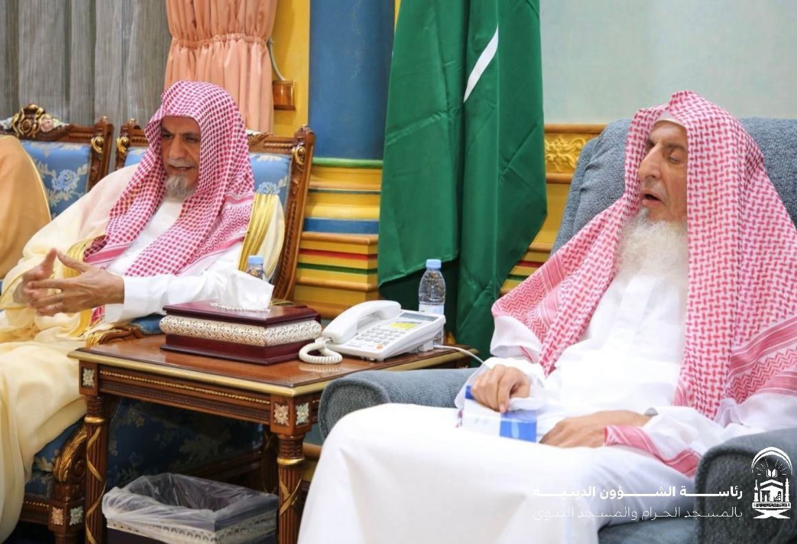 جاء ذلك خلال استقبال سماحة مفتي عام المملكة، معالي الشيخ الدكتور صالح بن عبدالله بن حميد إمام وخطيب المسجد الحرام وعضو هيئة كبار العلماء والمستشار بالديوان الملكي، وفضيلة الشيخ الدكتور بندر بليلة إمام وخطيب الحرم المكي وعضو هيئة كبار العلماء،ووفدا من رئاسة الشؤون الدينية للمسجد الحرام والمسجد النبوي، والمفتين والمدرسين في إدارة إجابة السائلين في رئاسة الشؤون الدينية، وذلك بمقر إقامة سماحته في مكة المكرمة مساء اليوم .
