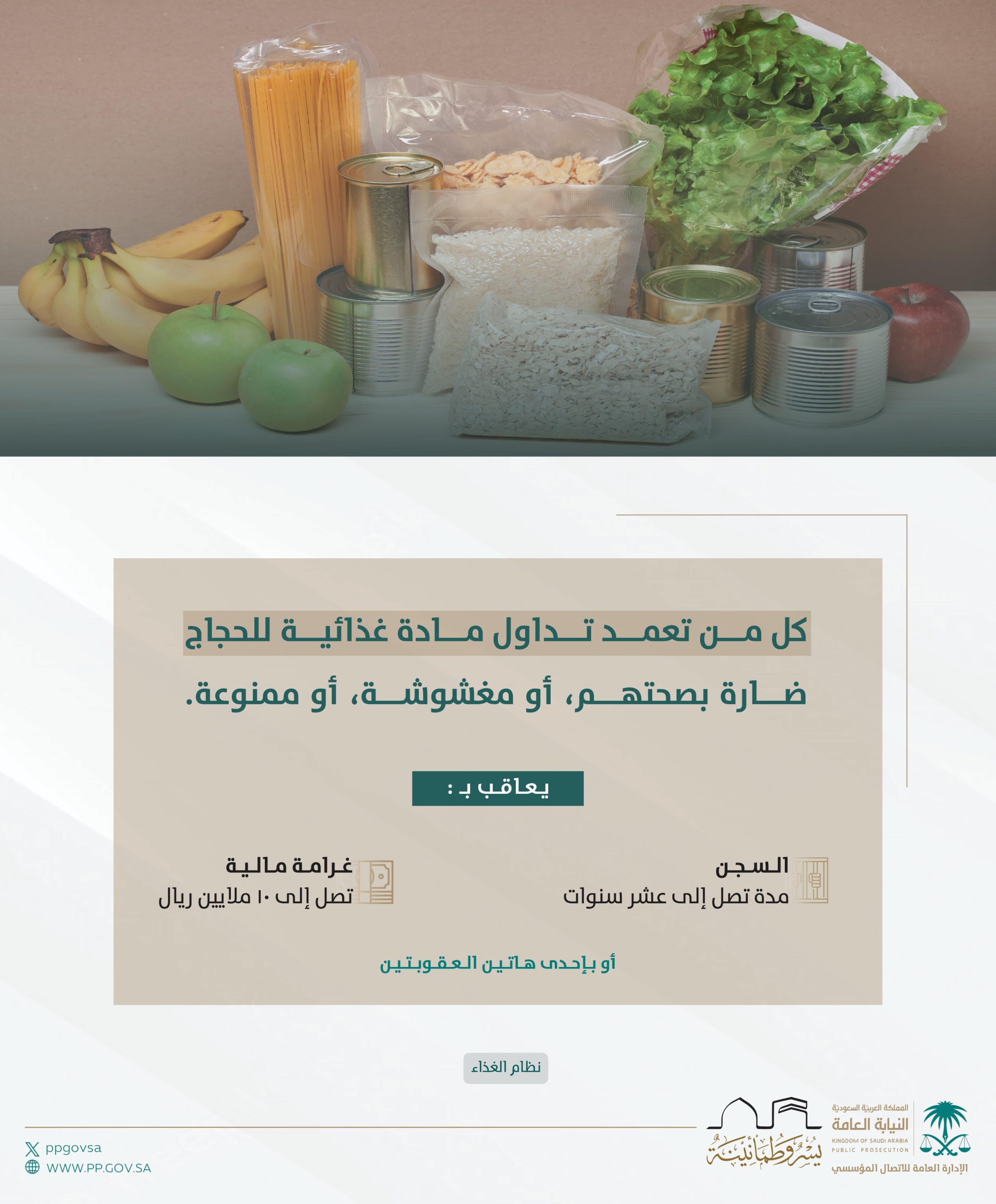 تحظى التغذية المخصصة للحجاج بحماية جنائية رفيعة تجاه أي تعمد بتداول مواد غذائية ضارة بالصحة أو مغشوشة أو ممنوعة، وقرر نظام الغذاء عقوبات مشددة حال ارتكاب أي من ذلك.