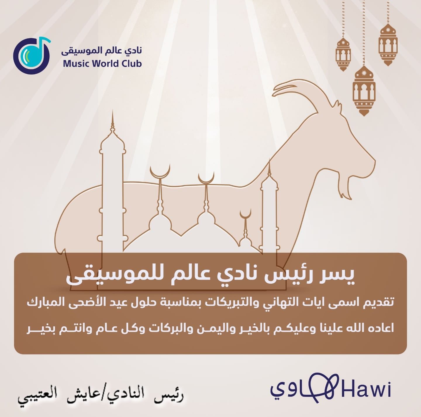 يقدم عايش العتيبي رئيس نادي عالم الموسيقى اسمى آيات التهاني والتبريكات لمقام خادم الحرمين الشريفين الملك سلمان بن عبدالعزيز آل سعود، ولصاحب السمو الملكي الأمير محمد بن سلمان بن عبد العزيز ولي العهد رئيس مجلس الوزراء -حفظهما الله-، وإلى الشعب السعودي والخليجي والعربي والإسلامي بمناسبة حلول عيد الاضحى المبارك والسعيد وعيدكم مبارك وسعيد وعساكم من عواده ومن العايدين وكل عام وانتم بخير وصحه وسلامه وعافيه