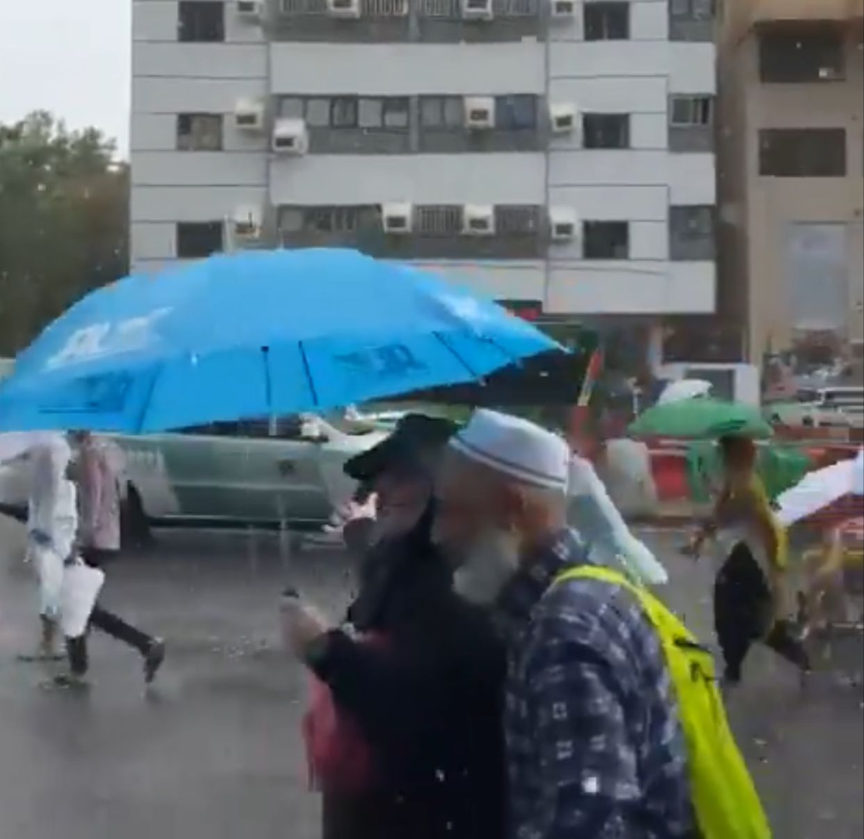 في وسط الصيف وكان الجميع يقول أن درجة الحرارة عالية بمكة، لكن سبحان الخالق ما أعظمه وهو الرحيم بعباده وبدون سابق إنذار تهطل أمطار غزيرة على المسجد الحرام في مكة بأول أيام التشريق .لتفاجؤوا الحجاج اليوم بهطول كميات غزيرة من الأمطار مصحوبة بحبات من البرد، مشيرين إلى أن هذه الأمطار ساهمت في تلطيف الأجواء بعد الارتفاعات القياسية لدرجة الحرارة في الأيام الماضية. لتتحول المظلات الشمسية التي تحميهم من حرارة الشمس إلى مظلات المطر .