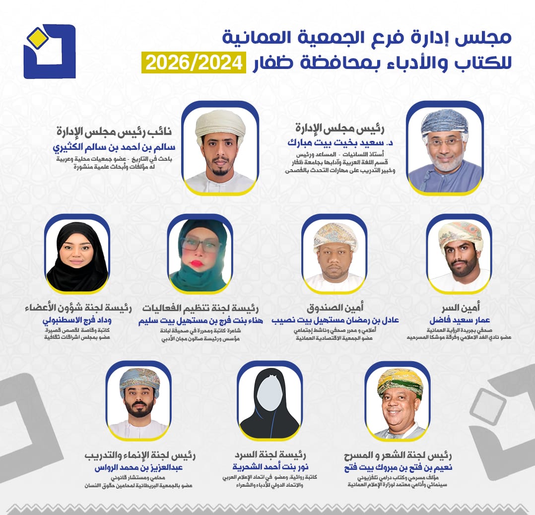 بعد اعتماد تزكية مجلس الإدارة الجديد لفرع الجمعية العمانية للكتاب و الأدباء بمحافظة ظفار بناء على التوافق بين أعضاء فرع الجمعية،