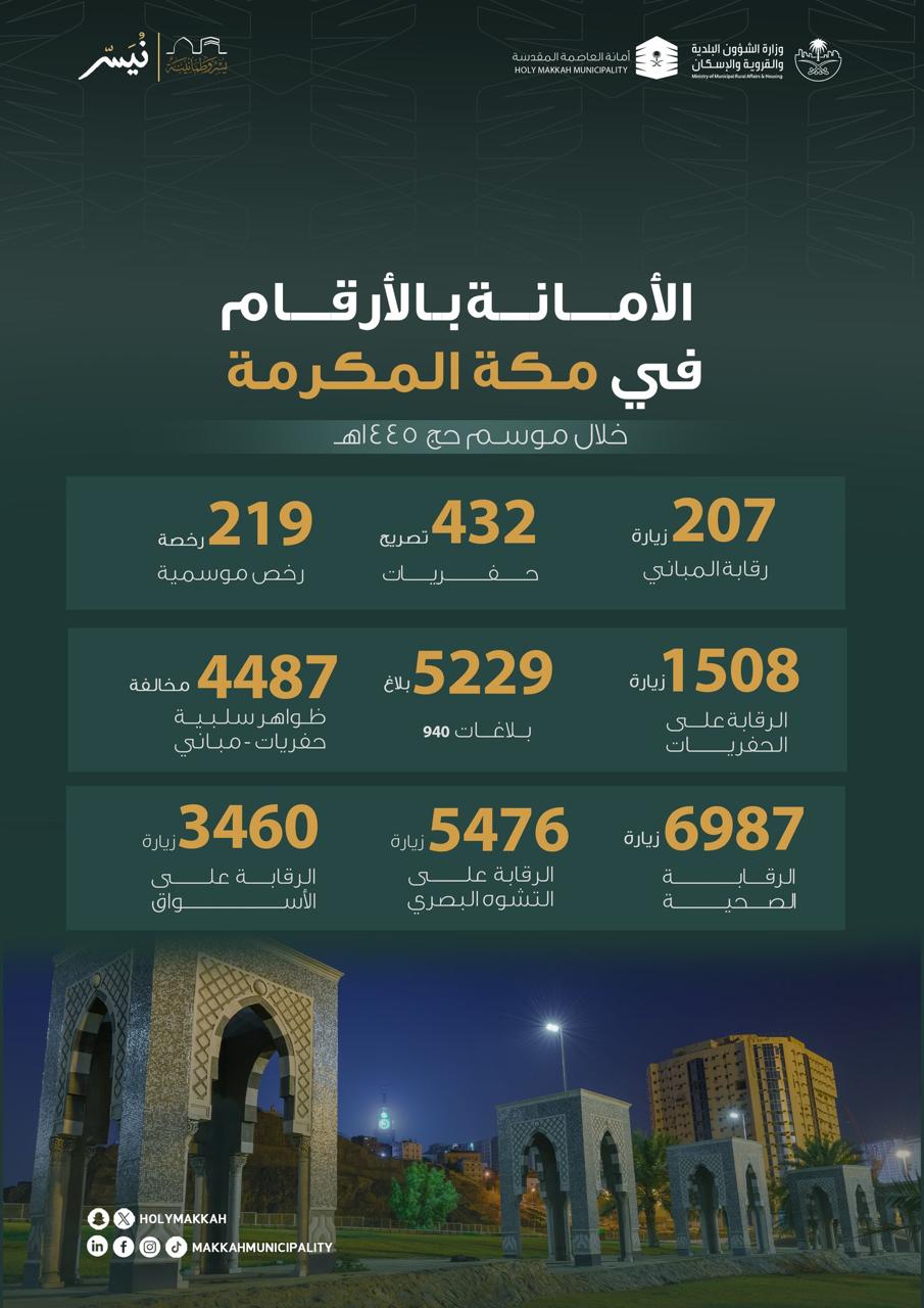أما في مكة المكرمة فقد أصدرت الأمانة 219 رخصة موسمية، و432 تصريحًا للحفريات، وأجرت 207 زيارات للرقابة على المباني، واكتشفت 4487 مخالفة تتعلق بظواهر سلبية.