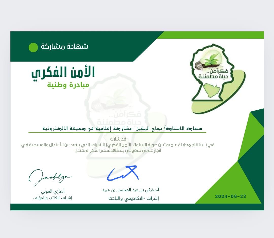تتقدم محموعة نادي الغد الإلكترونية برئاسة الأستاذ عبد العزيز عطية العنزي وكافة منسوبيها بأصدق التهاني والتبريكات للإعلامية الأستاذة : نجاح المقبل لتلقيها شهادة مشاركة في مبادرة علمية وطنية ( الأمن الفكري ) في ( استنتاج معادلة علمية تبين صورة السلوك الأمن الفكري ) للانحراف الذي يبتعد عن الاعتدال والوسطية في إنجاز علمي سعودي يستهدف نشر الفكر المعتدل .