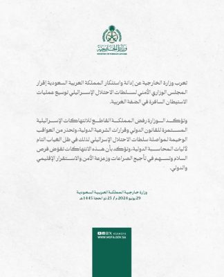 أعربت وزارة الخارجية عن إدانة واستنكار المملكة العربية السعودية إقرار المجلس الوزاري الأمني لسلطات الاحتلال الإسرائيلي توسيع عمليات الاستيطان السافرة في الضفة الغربية.