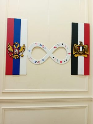 أهدت الفنانة مها الجندي لوحتها التي تحمل عنوان ” ما لانهاية ” للمركز الثقافي الروسي بالقاهرة وهي لوحة رسمت فيها علم البلدين مصر وروسيا في إطار فني وربطت بينهما بعلامة ما لانهاية وعليها حروف باللغتين الهيروغليفية والروسية تعبيرأ عن الصداقة الوطيدة بين الشعبين والعلاقات التاريخية الممتدة عبر الزمن.