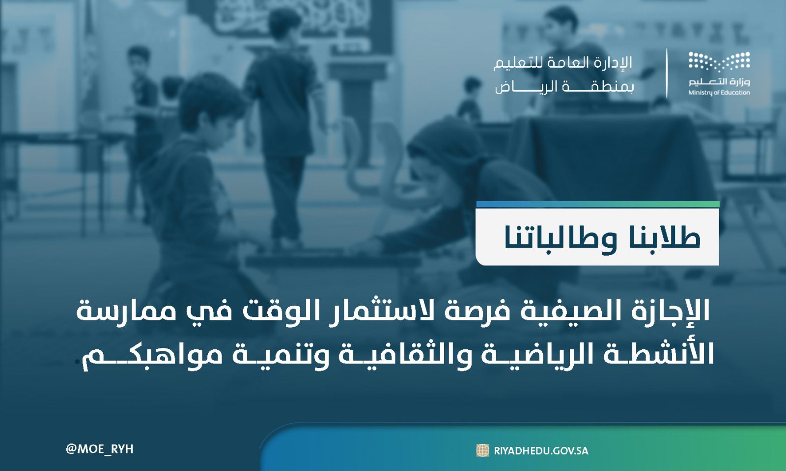 أطلقت الإدارة العامة للتعليم بمنطقة الرياض عدداً من الرسائل الاتصالية والتثقيفية ضمن خطتها الإعلامية لتوعية الطلاب والطالبات وأولياء الأمور للاستفادة من الإجازة الصيفية واستثمارها بما يعود عليهم بالنفع والفائدة، وذلك بمشاركة عددٍ من خبراء التربويين في عدد من المجالات المتنوعة .