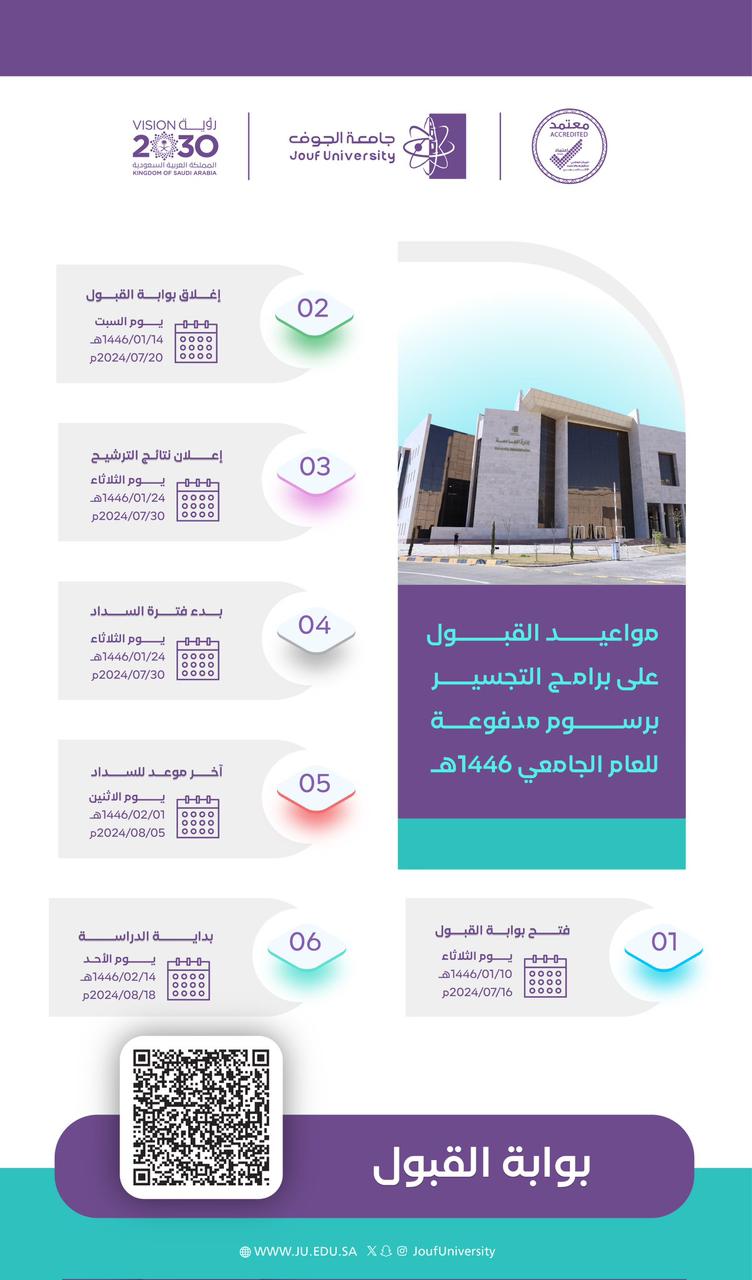 أعلنت جامعة الجوف، مواعيد القبول في برامج التجسير بالرسوم المدفوعة للعام الجامعي ١٤٤٦ هـ، التي تبدأ من الثلاثاء المقبل العاشر من محرم الجاري.
