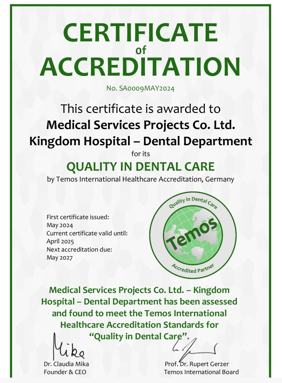 يذكر أن هيئة TEMOS هي منظمة دولية رائدة مقرها ألمانيا، وتمنح شهادات الاعتراف العالمية في جودة تقديم أفضل الممارسات الدولية في الرعاية السريرية وتجربة المرضى للمستشفيات والعيادات حول العالم. تُعدّ معايير TEMOS صارمة ودقيقة، وتغطي جميع جوانب الرعاية الصحية، بدءًا من سلامة المرضى وصولًا إلى جودة الخدمات الطبية وكفاءة الموظفين.