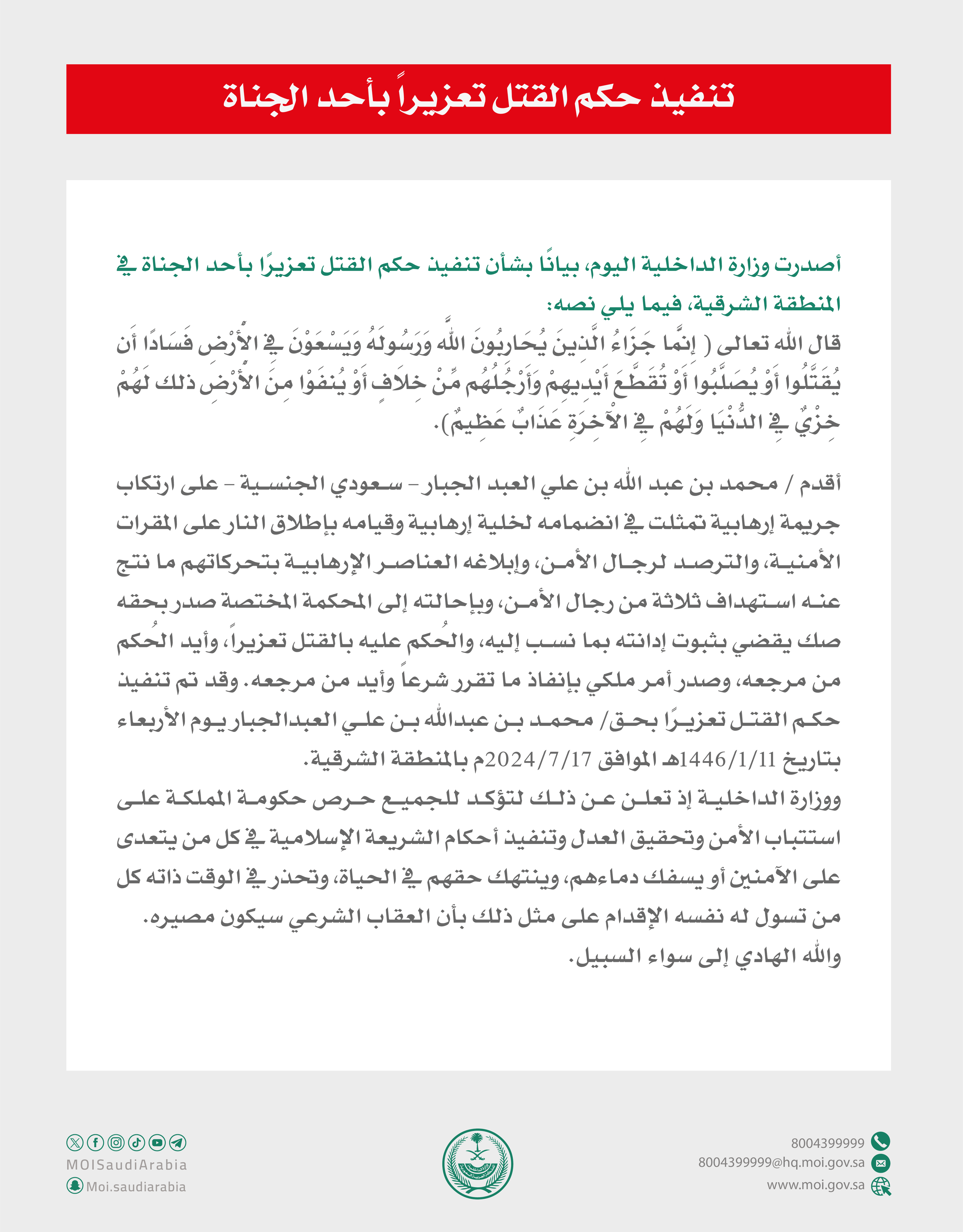 أعلنت وزارة الداخلية السعودية منذ قليل في بيان لها، تنفيذ حكم القتل بأحد العناصر الإرهابية بالمنطقة الشرقية.