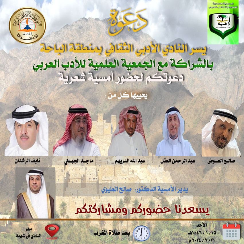 كما سيقيم النادي مساء الاثنين ١٦ / ١ / ١٤٤٦ هـ أمسية ثقافية بعنوان (حوار حول إبداع مثقفي الباحة وشعرائها) بعد صلاة المغرب (بمزرعة الزيتونة الزراعية ) بالباحة طريق العقيق يشارك فيها :