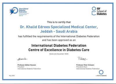 حصل الدكتور خالد إدريس الرئيس التنفيذي لمركز خالد إدريس الطبي على إعتماد الإتحاد الدولي للسكري International Diabetes Federation , IDF