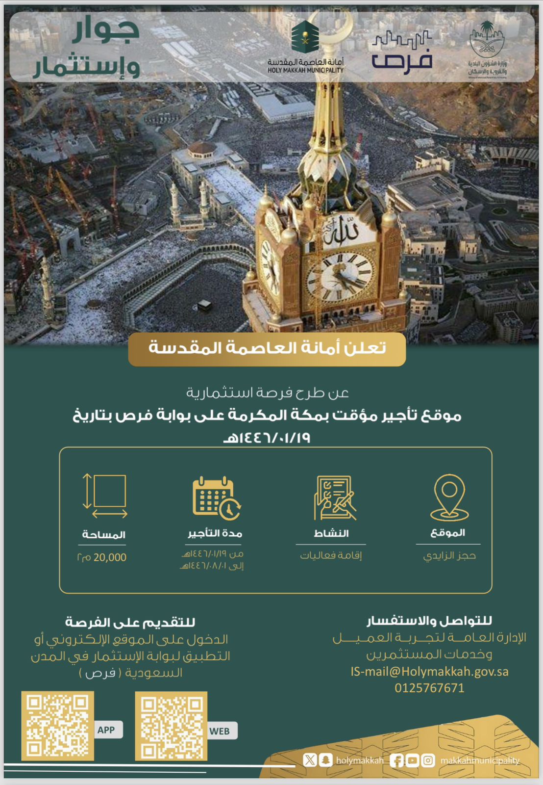 وأضافت الأمانة أن الفرص الجديدة تخدم السكان في مختلف نواحي مكة المكرمة ، وتتوزع بأنحاء العاصمة المقدسة ، وتضمنت طرح أربعة مواقع بمداخل مكة المكرمة لإقامة الفعاليات ، شملت حجر الشرائع والنوارية والليث والعمرة ، على مساحة ٢٠.٠٠٠ متر مربع للمنطقة الواحدة ، ومدة الايجار من 19/1/1446هـ الى 1/8/1446هـ ، داعيةً القطاع الخاص والمستثمرين إلى زيارة بوابة الاستثمار منصة (فرص)، والاطلاع على مزايا الفرص، خلال الفترة ١٩/١/١٤٤٦هـ ، وللإسهام في تحقيق المستهدفات المطلوبة.