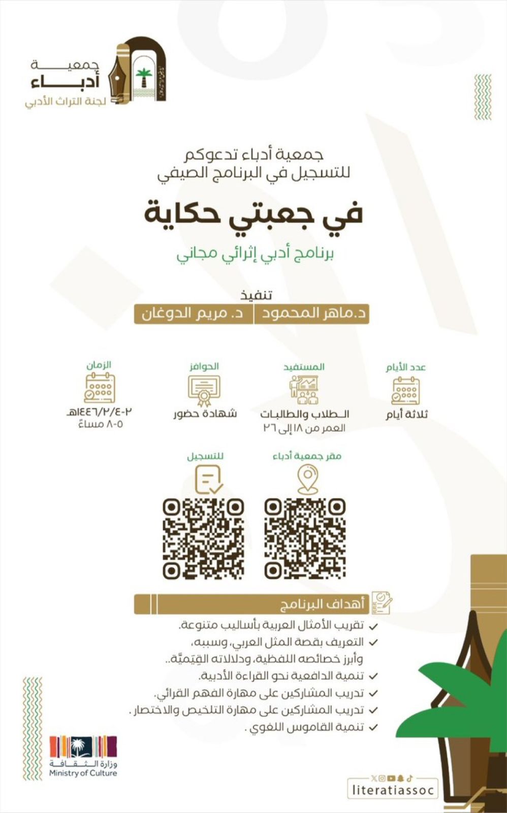 أعلنت جمعية أدباء الأحساء عن برنامجها الصيفي ( في جعبتي حكاية ) وهو برنامج أدبي إثرائي مجاني ينطلق من يوم 2 حتى يوم 4 من شهر صفر 1446 من الساعة الخامسة حتى الثامنة مساء ينفذه د. ماهر المحمود ، و د. مريم الدوغان في مقر الجمعية .