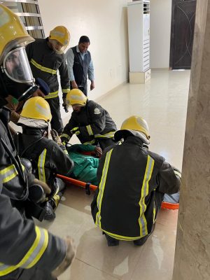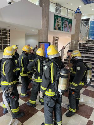 وقد بدأت الفرضية بإطلاق صفارات الإنذار داخل المبنى، حيث تم إخلاء الموظفين والمراجعين بسرعة منظمة إلى نقاط التجمع الآمنة؛ وتدخلت فرق الدفاع المدني بسرعة، حيث قامت بإطفاء “الحريق” باستخدام أحدث المعدات والتقنيات المتاحة؛ كما قدمت فرق الهلال الأحمر الإسعافات الأولية للمصابين “الافتراضيين”، ونُقلوا إلى المستوصف المحلي لتلقي العلاج.