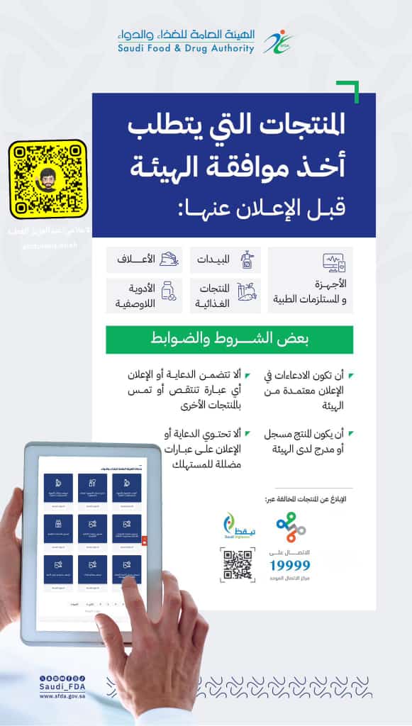 أكدت الهيئة العامة للغذاء والدواء ضرورة وإلزامية أخذ الموافقة قبل الإعلان عن المنتجات الخاضعة لإشرافها، وذلك لضمان سلامتها، حفاظًا على الصحة العامة.
