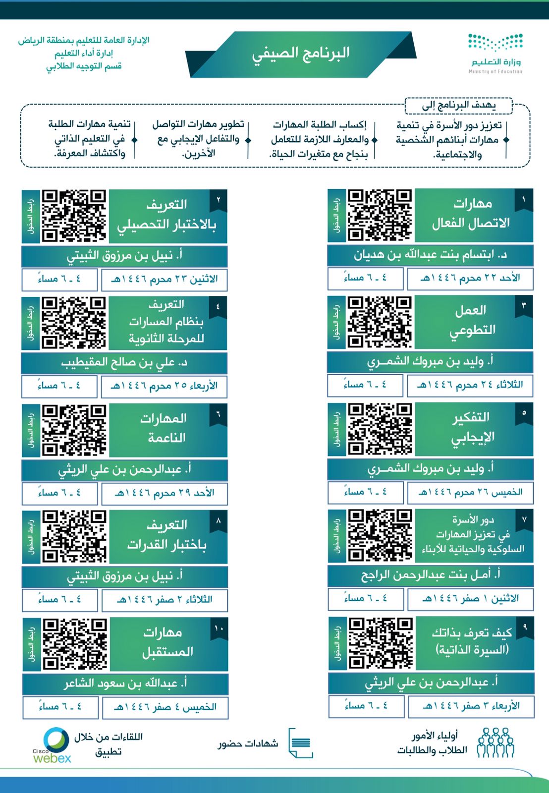 ويُقام البرنامج ‏‏”عن بُعد” خلال الفترة المسائية على مدى 10 أيام من الساعة 4 إلى ‏‏6 مساءً وذلك عبر برنامج ‏webex‏‏، ويُمنح فيه المشاركون من أولياء الأمور والطلبة ‏شهادة ‏حضور.‏ ‏