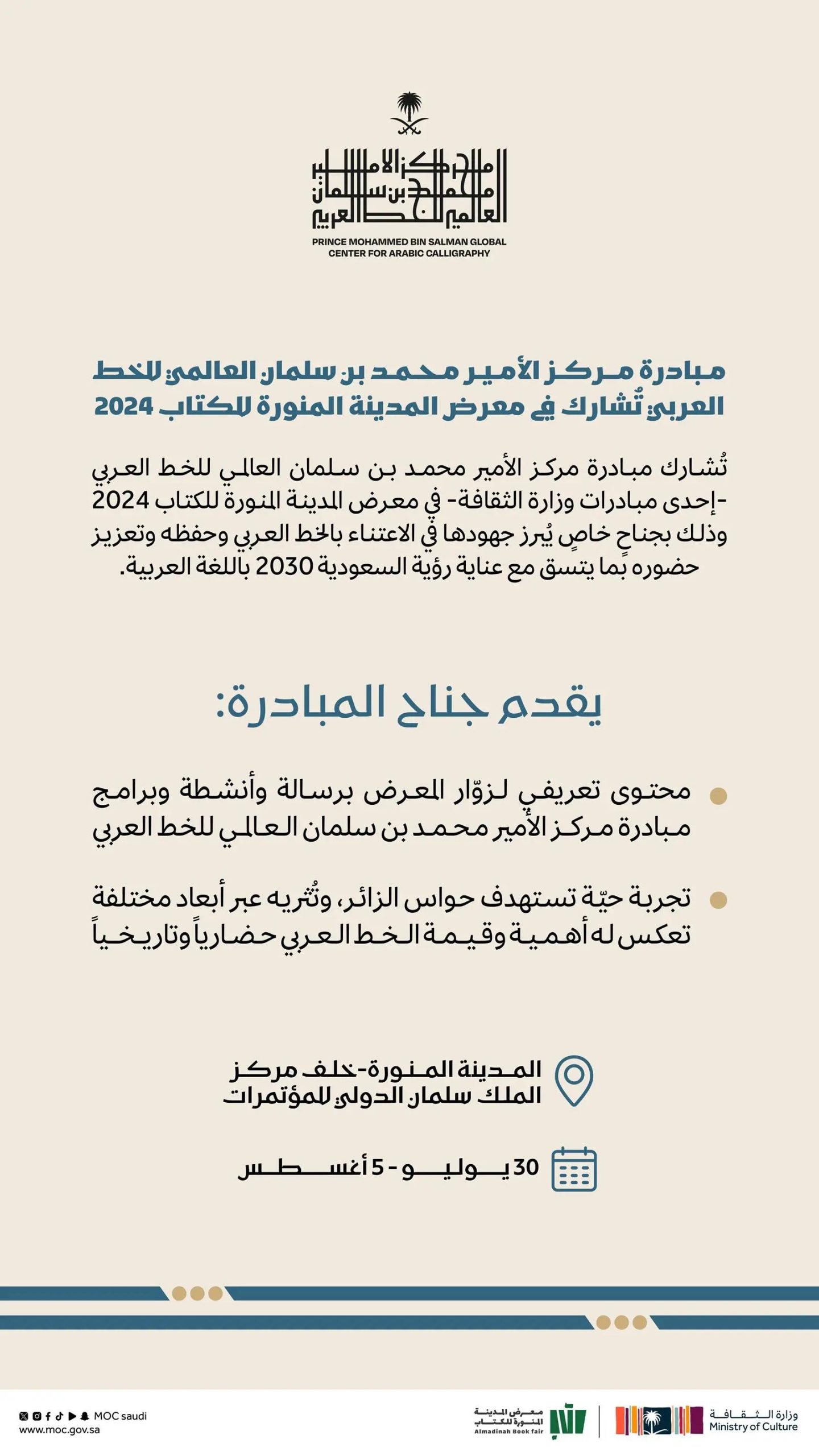 تُشارك مبادرة مركز الأمير محمد بن سلمان العالمي للخط العربي – إحدى مبادرات وزارة الثقافة – في معرض المدينة المنورة للكتاب 2024 الذي سيقام اليوم، ويستمر حتى الـ 5 من أغسطس القادم، وذلك بجناحٍ خاصٍ يُبرز جهودها في الاعتناء بالخط العربي، وحفظه وتعزيز حضوره بما يتسق مع عناية رؤية المملكة 2030 باللغة العربية.