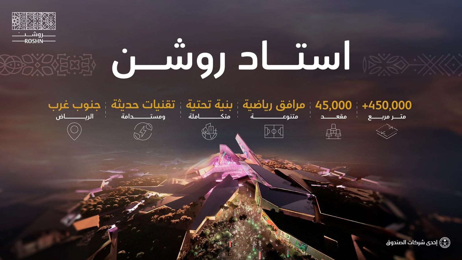 أعلنت مجموعة “روشن”، المطور العقاري الوطني الرائد وإحدى شركات صندوق الاستثمارات العامة، عن إنشاء ملعب أيقوني بمواصفات عالمية تصل سعته إلى 45,000 مقعد على مساحة إجمالية تزيد عن 450 ألف متر مربع جنوب غرب مدينة الرياض.
