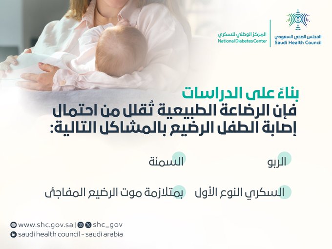 أعلن المجلس الصحي السعودي أن الرضاعة الطبيعية تُقلل من احتمال إصابة الطفل الرضيع بالسكري النوع الأول
